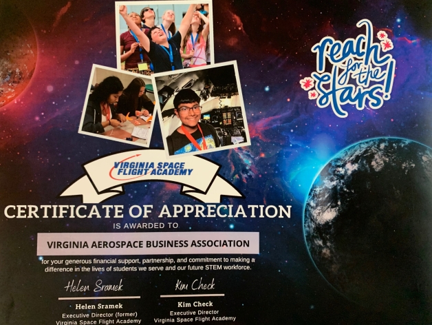 VASBA is honored to have received this Certificate of Appreciation from the Virginia Space Flight Academy